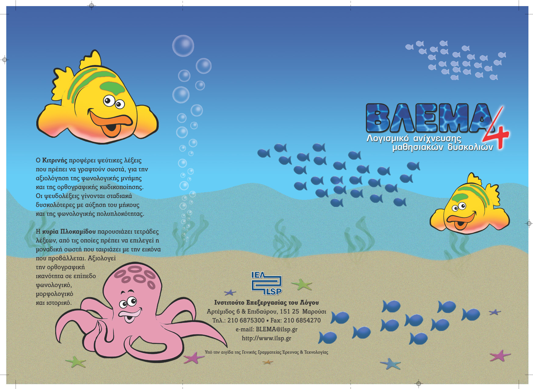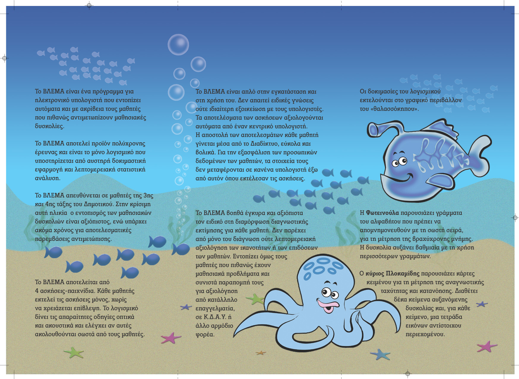 Το ΒΛΕΜΑ είναι ένα πρόγραμμα για ηλεκτρονικό υπολογιστή που εντοπίζει αυτόματα και με ακρίβεια τους μαθητές που πιθανώς αντιμετωπίζουν μαθησιακές δυσκολίες. Το ΒΛΕΜΑ αποτελεί προϊόν πολύχρονης έρευνας και είναι το μόνο λογισμικό που υποστηρίζεται από αυστηρή δοκιμαστική εφαρμογή και λεπτομερειακή στατιστική ανάλυση. Το ΒΛΕΜΑ απευθύνεται σε μαθητές της 3ης και 4ης τάξης του Δημοτικού. Στην κρίσιμη αυτή ηλικία ο εντοπισμός των μαθησιακών δυσκολιών είναι αξιόπιστος, ενώ υπάρχει ακόμα χρόνος για αποτελεσματικές παρεμβάσεις αντιμετώπισης. Το ΒΛΕΜΑ αποτελείται από 4 ασκήσεις–παιχνίδια. Κάθε μαθητής εκτελεί τις ασκήσεις μόνος, χωρίς να χρειάζεται επίβλεψη. Το λογισμικό δίνει τις απαραίτητες οδηγίες οπτικά και ακουστικά και ελέγχει αν αυτές ακολουθούνται σωστά από τους μαθητές. Το ΒΛΕΜΑ είναι απλό στην εγκατάσταση και στη χρήση του. Δεν απαιτεί ειδικές γνώσεις ή ιδιαίτερη εξοικείωση με τους υπολογιστές. Τα αποτελέσματα των ασκήσεων αξιολογούνται αυτόματα από έναν κεντρικό υπολογιστή. Η αποστολή των αποτελεσμάτων κάθε μαθητή γίνεται μέσα από το Διαδίκτυο, εύκολα και βολικά. Για την εξασφάλιση των προσωπικών δεδομένων των μαθητών, τα στοιχεία τους δεν μεταφέρονται σε κανένα υπολογιστή έξω από αυτόν όπου εκτέλεσαν τις ασκήσεις. Το ΒΛΕΜΑ βοηθά έγκυρα και αξιόπιστα τον ειδικό στη διαμόρφωση διαγνωστικής εκτίμησης για κάθε μαθητή. Δεν παρέχει από μόνο του διάγνωση ούτε λεπτομερειακή αξιολόγηση των ικανοτήτων ή των επιδόσεων των μαθητών. Εντοπίζει όμως τους μαθητές που πιθανώς έχουν μαθησιακά προβλήματα και συνιστά παραπομπή τους για αξιολόγηση από κατάλληλο επαγγελματία, σε Κ.Δ.Α.Υ. ή άλλο αρμόδιο φορέα. Οι δοκιμασίες του λογισμικού εκτελούνται στο γραφικό περιβάλλον του «θαλασσόκηπου». Η Φωτεινούλα παρουσιάζει γράμματα του αλφαβήτου που πρέπει να απομνημονευθούν με τη σωστή σειρά, για τη μέτρηση της βραχύχρονης μνήμης. Η δυσκολία αυξάνει βαθμιαία με τη χρήση περισσότερων γραμμάτων. Ο κύριος Πλοκαμίδης παρουσιάζει κάρτες κειμένου για τη μέτρηση της αναγνωστικής ταχύτητας και κατανόησης. Διαθέτει δέκα κείμενα αυξανόμενης δυσκολίας και, για κάθε κείμενο, μια τετράδα εικόνων αντίστοιχου περιεχομένου. Ο Κιτρινής προφέρει ψεύτικες λέξεις που πρέπει να γραφτούν σωστά για την αξιολόγηση της φωνολογικής μνήμης και ορθογραφικής κωδικοποίησης. Οι ψευδολέξεις γίνονται σταδιακά δυσκολότερες με αύξηση του μήκους και της φωνολογικής πολυπλοκότητας. Η κυρία Πλοκαμίδου παρουσιάζει τετράδες λέξεων, από τις οποίες πρέπει να επιλεγεί η μοναδική σωστή που ταιριάζει με την εικόνα που προβάλλεται. Αξιολογεί την ορθογραφική ικανότητα σε επίπεδο φωνολογικό, μορφολογικό και ιστορικό.